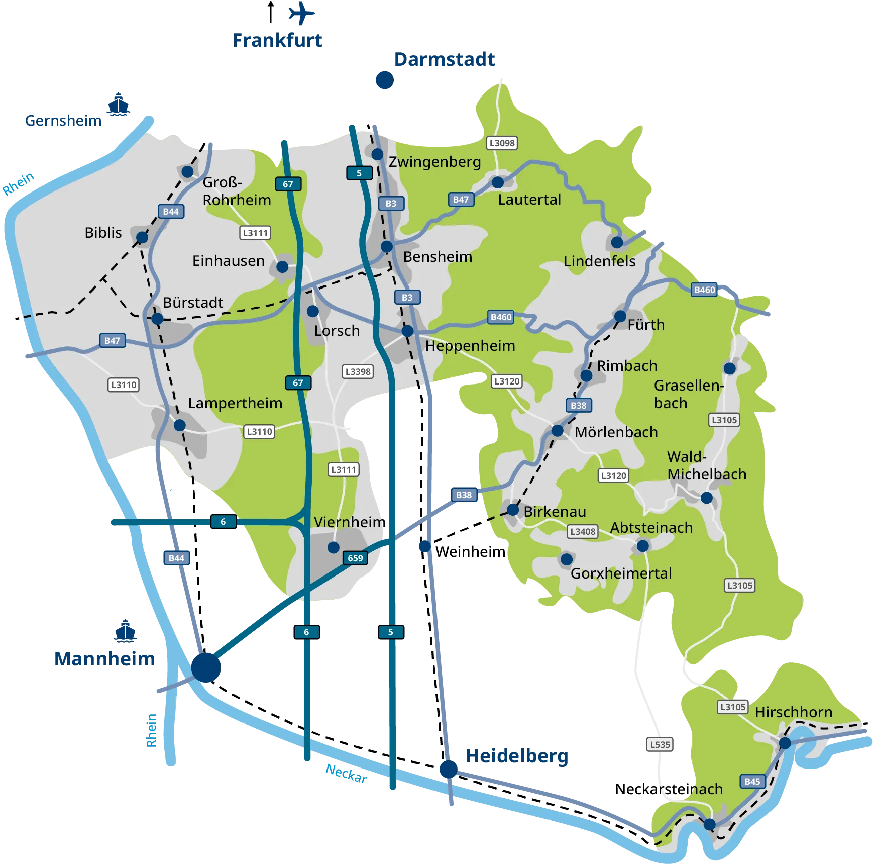 Die Wirtschaftsregion Bergstraße liegt in der Mitte der Metropolregionen Rhein-Main und Rhein-Neckar, in einem der stärksten Wirtschaftsräume Deutschlands und Europas und ist optimal erreichbar. Sie bietet Unternehmen sowie Fachkräften ideale Voraussetzungen.